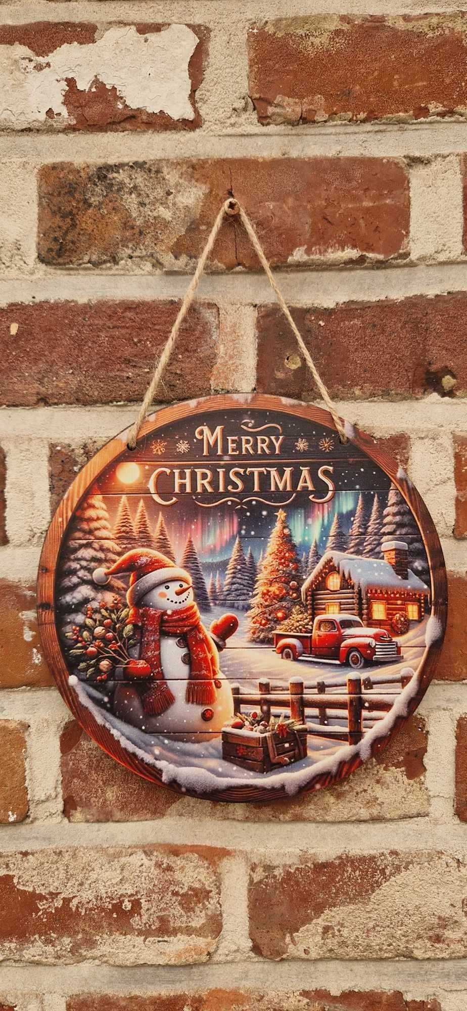 RK Houten Bord Rond "Merry Christmas met sneeuwpop"