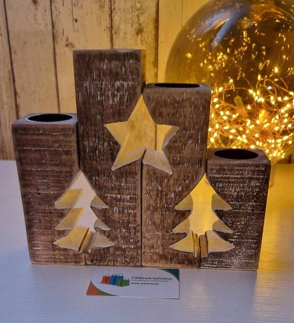 Zeer mooie houten waxinehouder van 4 blokken met uitgesneden kerstbomen en ster. Erkunnen 4 theelichtjes in gedaan worden.