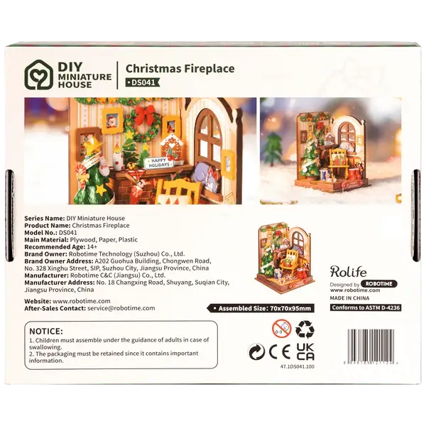 Fijne kerst, met houten bouwpakket Robotime bij de open haard