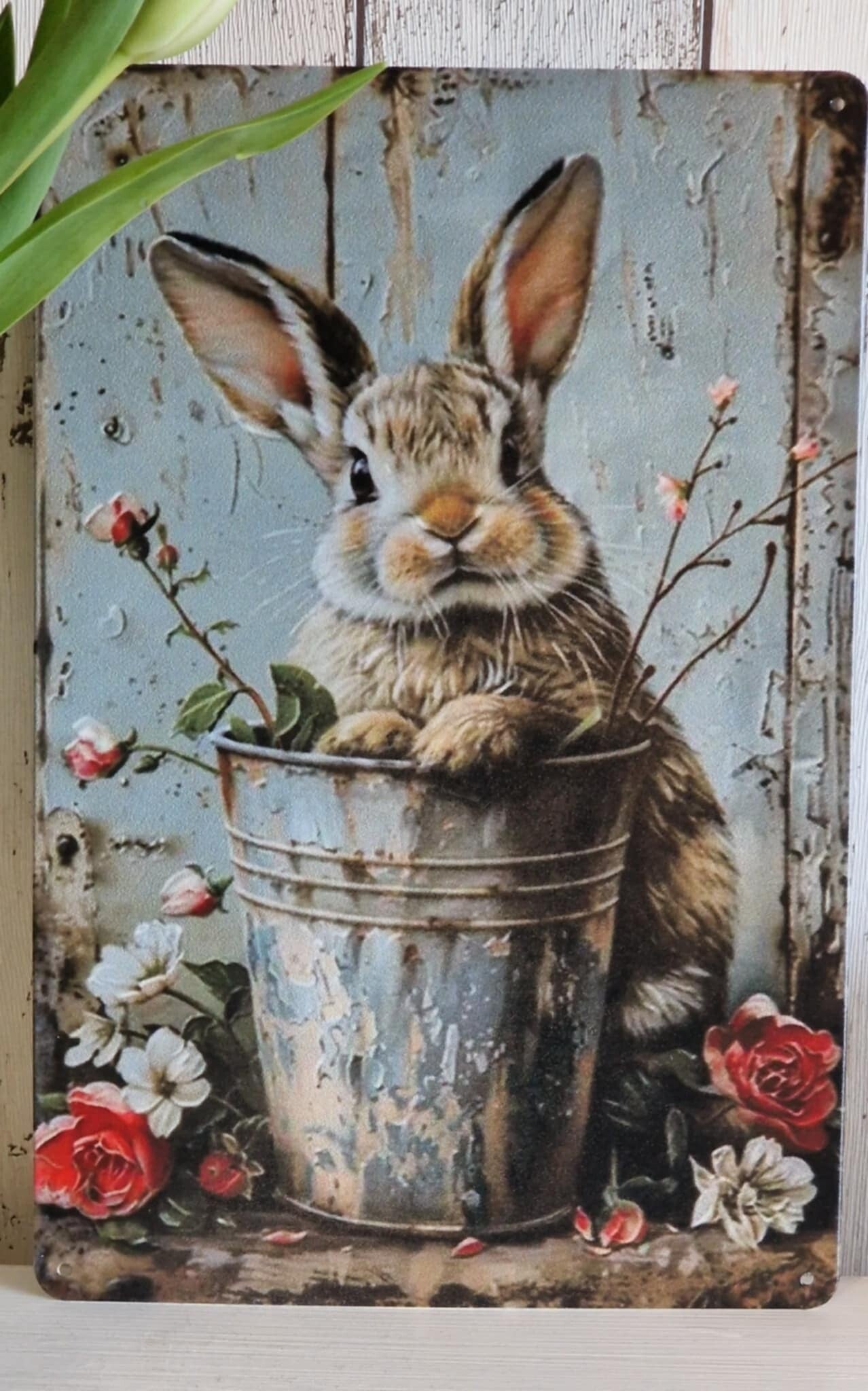 Prachtig metalen bord met Konijn en emmer. Kan binnen of buiten gehangen worden.