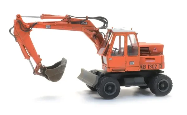 Deze prachtig gedetailleerde schaalmodelgraafmachine van Artitec stelt de iconische Atlas AB 1302 D voor, een mobiele graafmachine die veelvuldig werd ingezet op bouwplaatsen in de jaren 70 en 80.