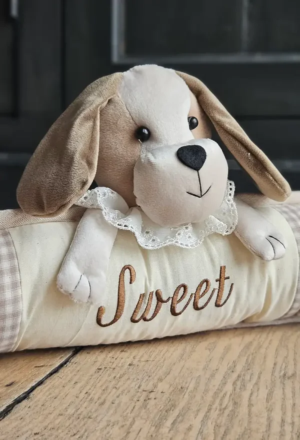 Home Sweet Home – Tochtstopper Deze charmante tochtstopper met hondje is niet alleen praktisch, maar ook een echte eyecatcher in uw interieur. De neutrale tinten en zachte stofjes geven hem een warme, landelijke uitstraling. Ideaal om tocht buiten te houden én tegelijk gezelligheid in huis te brengen.
