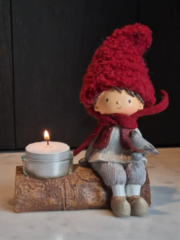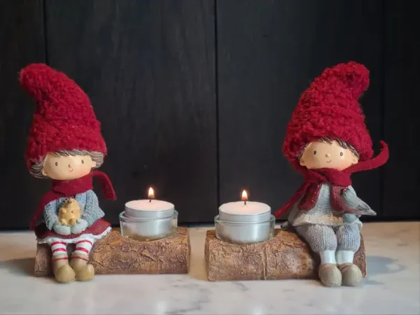 Duo “Kerstgezellig” – met warm rood Voor wie van klassieke kerstsfeer houdt: rijke roodtinten, gebreide mutsen en sjaals, en dezelfde lieve details. De twee figuurtjes zitten knus naast het kaarsje; instant gezelligheid tussen dennengroen, dennenappels en rode accenten. Pluspunten Warme, feestelijke kleuren Sfeermaker op tafel, schouw of tray Theelichthouder geschikt voor standaard theelichtjes