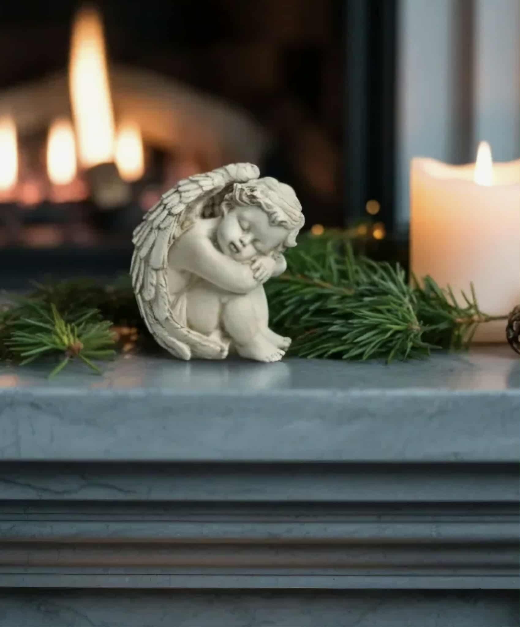 “In de stilte van een winteravond, waar het zachte licht van kaarsen zich mengt met de warmte van het haardvuur, rust een klein engeltje. Met gevouwen vleugels en gesloten ogen bewaakt het de vrede in huis"