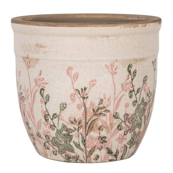 Breng een warme en romantische sfeer in huis met deze prachtige keramieken bloempot van Clayre & Eef. De zachte beige kleur, gecombineerd met het verfijnde bloemenmotief in roze en groene tinten, geeft deze pot een charmante en landelijke uitstraling.